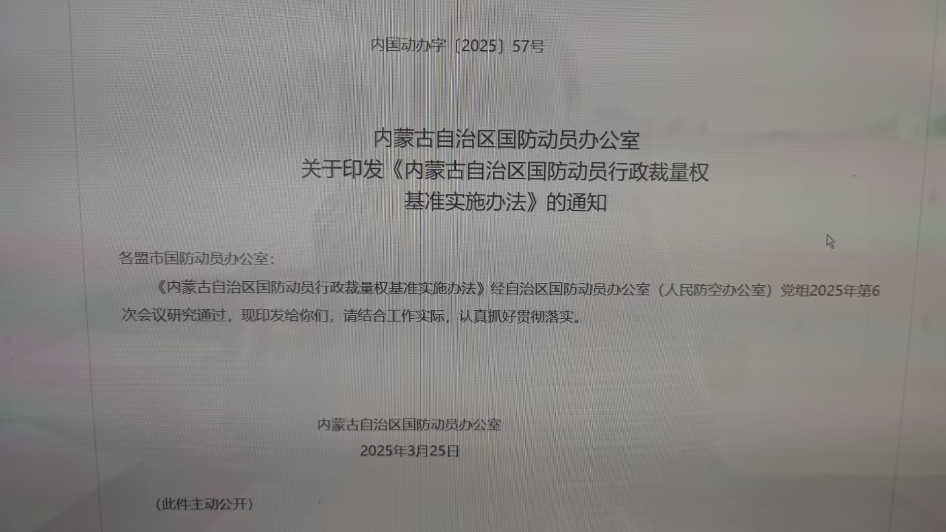 《内蒙古自治区国防动员行政裁量权基准实施办法》经自治区国防动员办公室(人民防空办公室)党组2025年第6次会议研究通过,现印发给你们,请结合工作实际,认真抓好贯彻落实。