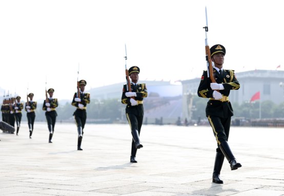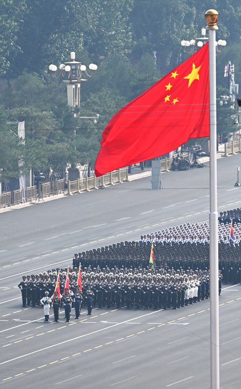 9月3日,纪念中国人民抗日战争暨世界反法西斯战争胜利80周年大会在北京隆重举行。这是国旗护卫队在行进中。