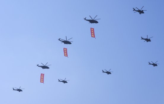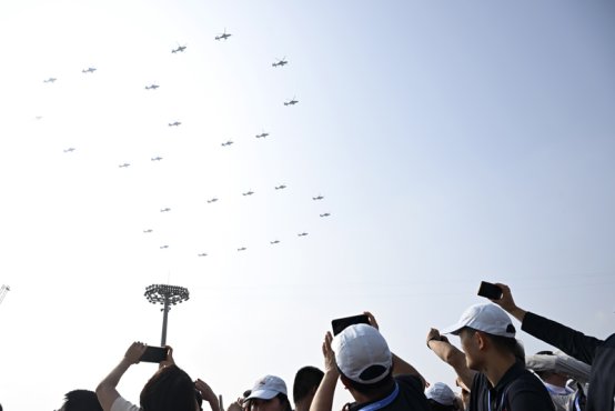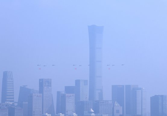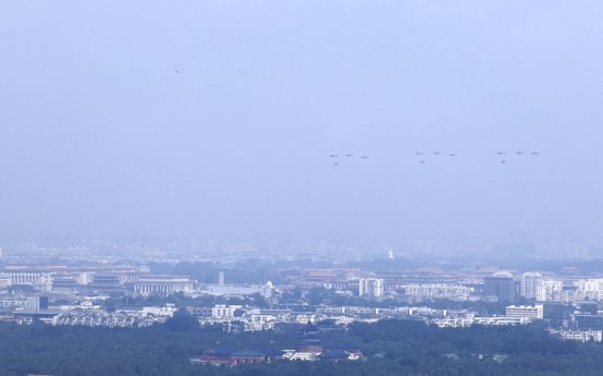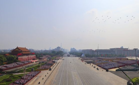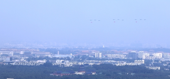 9月3日,纪念中国人民抗日战争暨世界反法西斯战争胜利80周年大会在北京隆重举行。这是空中护旗梯队。